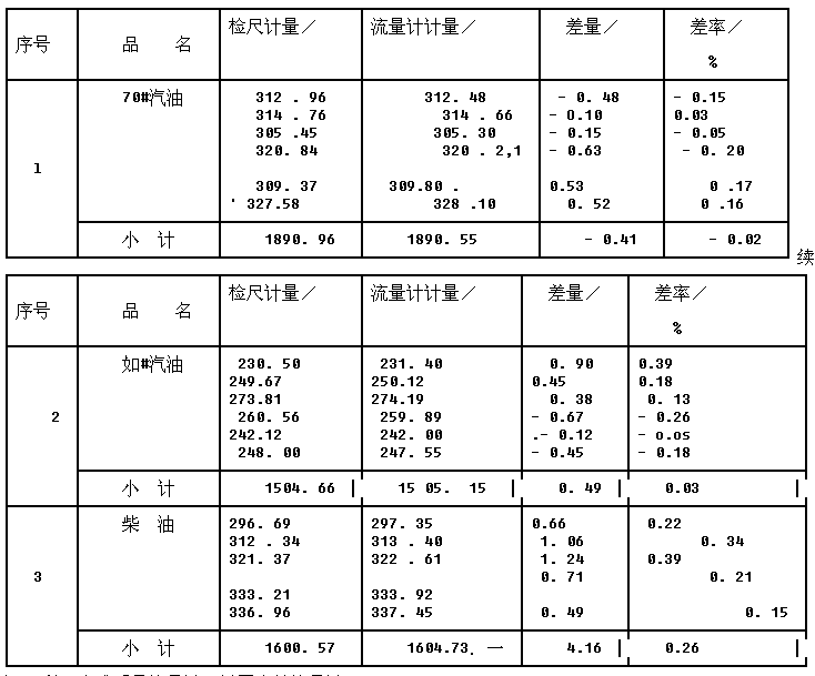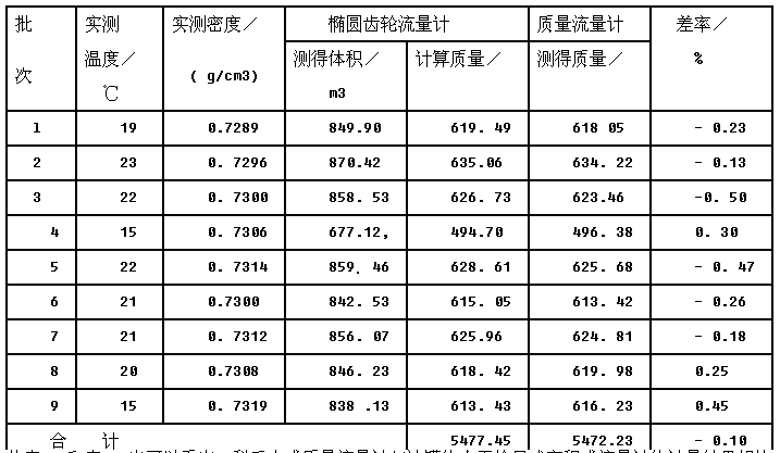 作為一個應用實例,表6-1給出了科氏力式質量流量計計量70#汽油、90#汽油、柴油,與油罐的人工檢尺的比對結果;表6-2則記錄了科氏力式質量流量計汁量石腦油,與橢圓