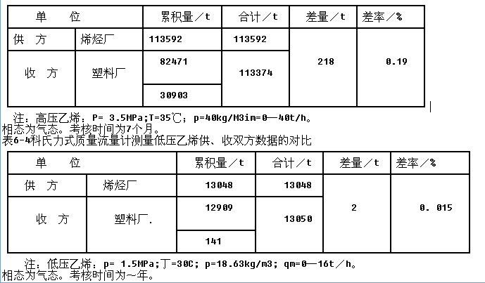 量計進行計量。當投運科氏力式質量流量計之后,上、下游交接計量的差異大為減小。表6-3和表6-4分別記錄了高壓乙烯和低壓乙烯供、收雙方的測量數據比對。由表中可以看出